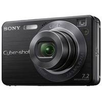 Câmera compacta e repleta de funções com caixa de alumínio com acabamento preto. Resolução de 7.2 megapixels e lente com zoom óptico 4x e LCD de 2,5 polegadas.